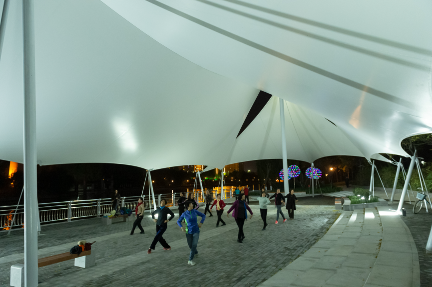 帆影廣場是以增加室外設施,打造濱水觀景平臺和親水休閑活動空間為主,在設計上結(jié)合周邊環(huán)境突出濱水景觀,在廣場設置張拉膜以呼應帆影廣場主題,合理規(guī)劃現(xiàn)場高差,設置臺階、造型坐凳、景觀燈等,滿足實用功能,豐富景觀效果。